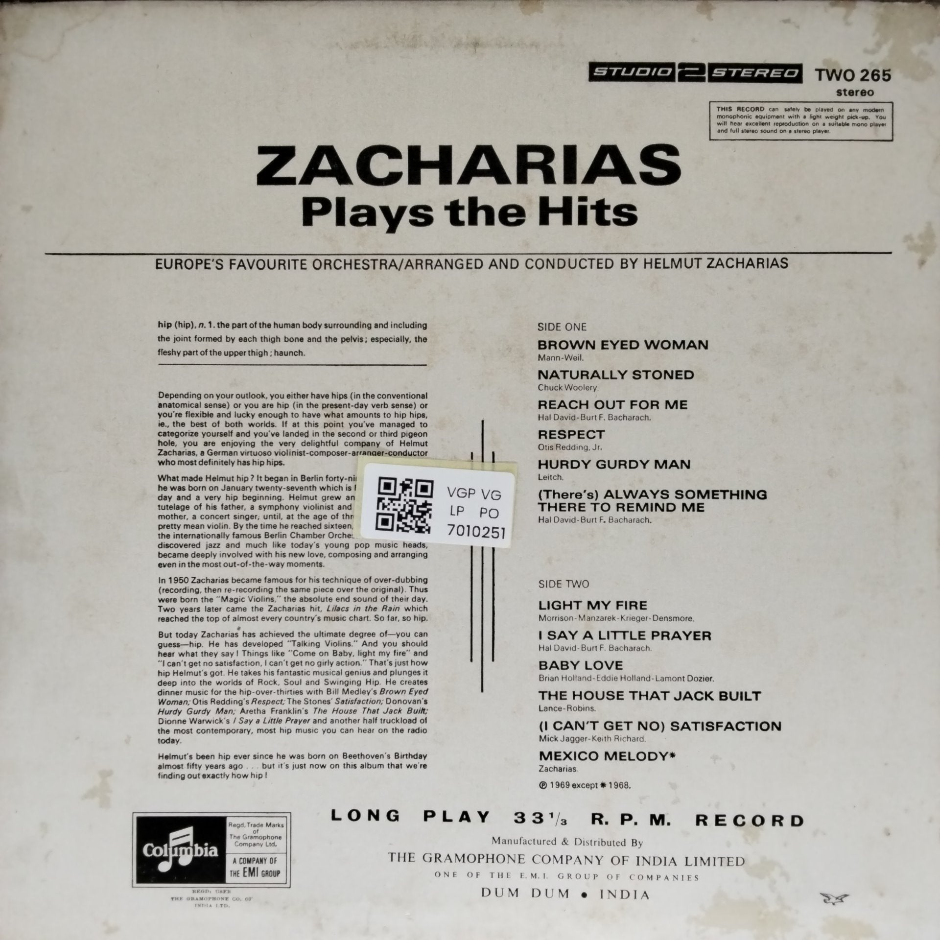 Generally worth 50% of the Near Mint value. A Very Good Plus record will show some signs that it was played and otherwise handled by a previous owner who took good care of it. Defects should be more of a cosmetic nature, not affecting the actual playback as a whole. Record surfaces may show some signs of wear and may have slight scuffs or very light scratches that don’t affect one’s listening experiences. Some background crackle esp in silent pasages is acceptable. Slight warps that do not affect the sound are “OK”. The label may have some ring wear or discoloration, but it should be barely noticeable. Spindle marks may be present. Picture sleeves and inner sleeves will have some slight wear, slightly turned-up corners, or a slight seam split. An LP cover may have slight signs of wear, and may be marred by a cut-out hole, indentation, or cut corner. In general, if not for a couple of minor things wrong with it, this would be Near Mint.